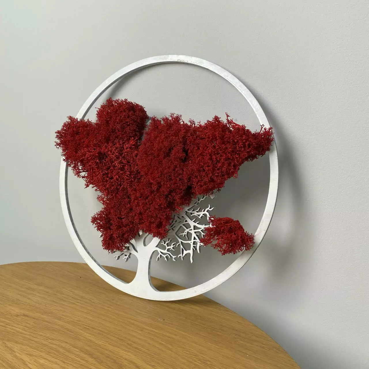 1. Материал: Основа панно изготовлена ​​из фанеры, которая выкрашена в белый цвет. Эта основа надежно удерживает стабилизированный мох и придает эстетичный вид изделия.