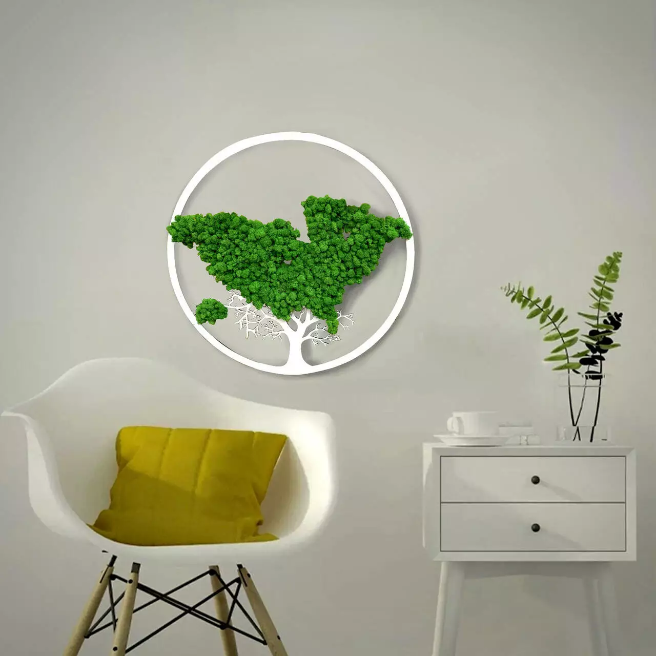 1. Материал: Основа панно изготовлена ​​из фанеры, которая выкрашена в белый цвет. Эта основа надежно удерживает стабилизированный мох и придает эстетичный вид изделия.